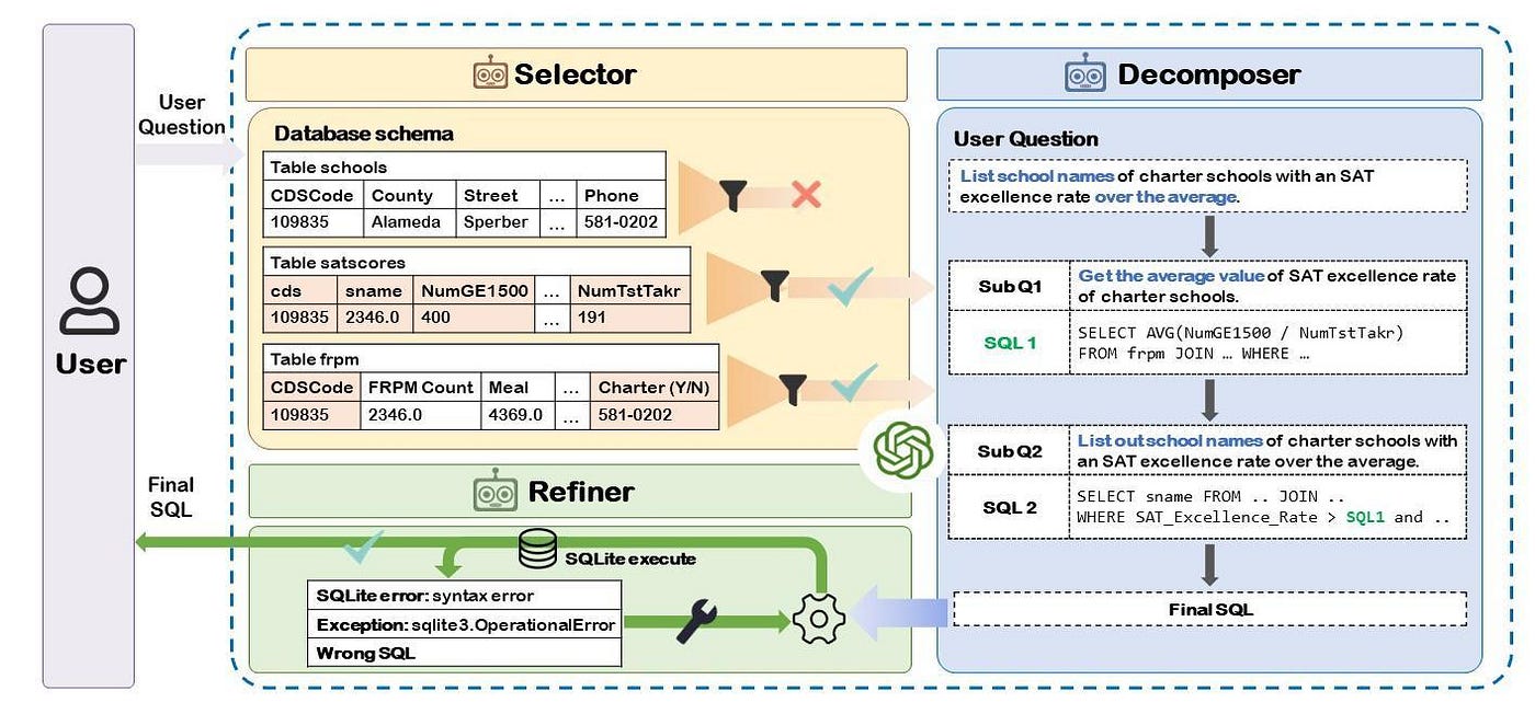 MAG-SQL introduces a multi-agent generative framework designed to improve Text-to-SQL performance, particularly on complex datasets like BIRD. Key features include soft schema linking, a targets-conditions decomposition method for handling complex queries, and iterative Sub-SQL refinement through a generator and refiner module. MAG-SQL achieves an impressive execution accuracy of 61.08% on BIRD, surpassing the performance of vanilla GPT-4 (46.35%) and MAC-SQL (57.56%).